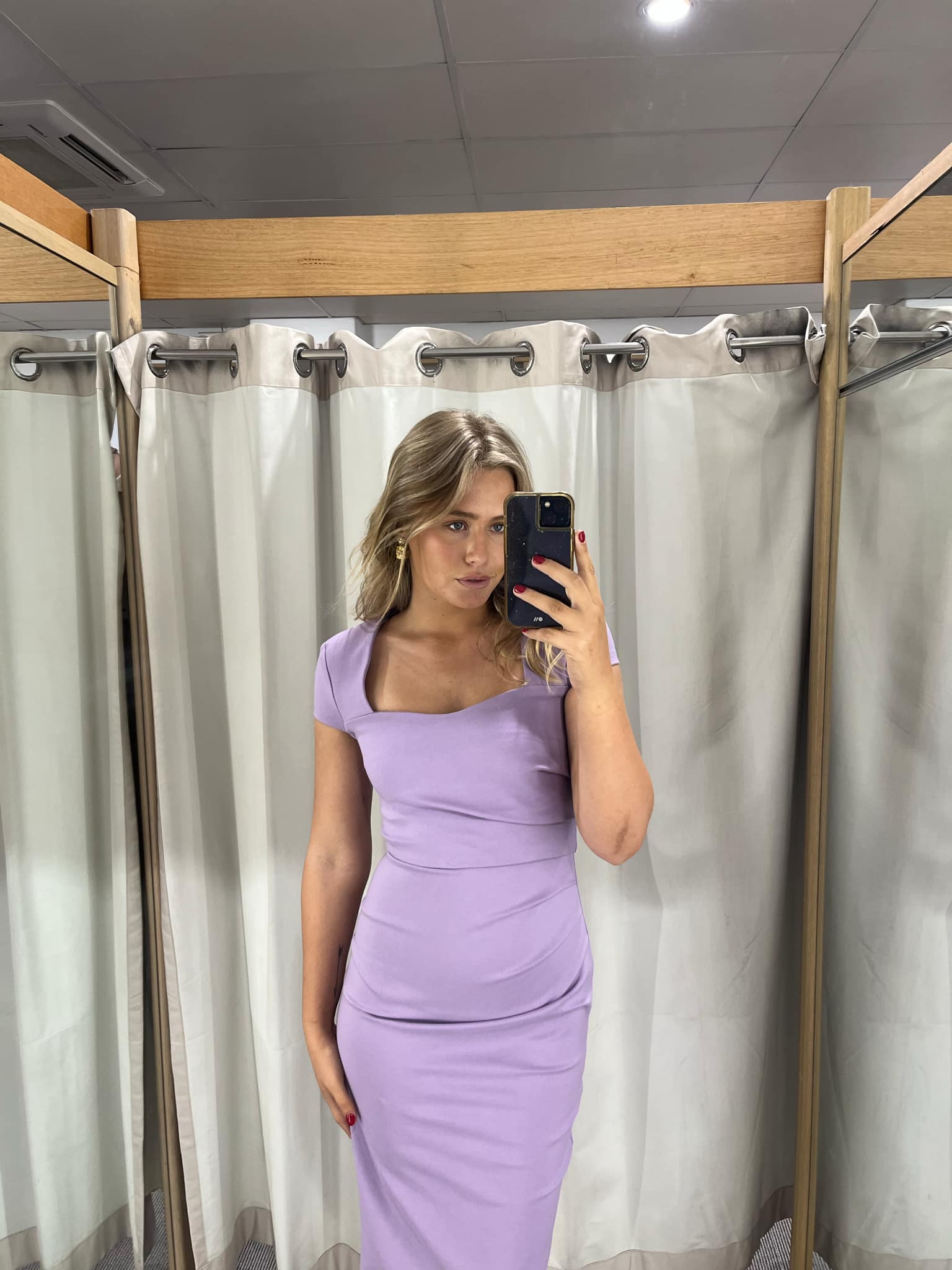 - Fitted midi dress with cap sleeves for added arm coverage and structure